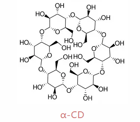 阿爾法環(huán)糊精(α-CD),分子式C36H60O30,分子量為972.84,為白色或類(lèi)白色無(wú)定形或結(jié)晶性粉末,易溶于水和丙二醇,幾乎不溶于乙醇和二氯甲烷。α-CD是由6個(gè)葡萄糖單位經(jīng)α-1,4糖苷鍵連接成環(huán)形結(jié)構(gòu)的糊精,是葡萄糖基轉(zhuǎn)移酶作用于淀粉糖漿的產(chǎn)物。α-CD水溶解度在25℃為14.5g/100ml,應(yīng)用于要求環(huán)狀糊精溶解度較高的場(chǎng)合。由于α-CD的內(nèi)腔尺寸小于β-CD,更適合于包結(jié)小分子量的脂肪型客體(如聚乙二醇、多烯烴、脂肪酸等),使其更穩(wěn)定。