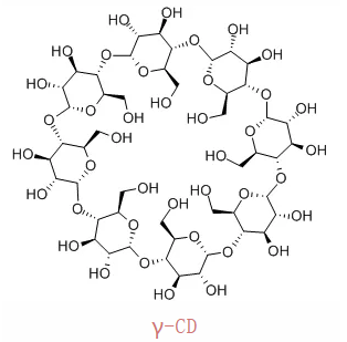 伽馬環(huán)糊精(γ-CD),是一種非還原性環(huán)狀糖類(lèi),由8個(gè)α-1,4糖苷鍵連接的D-吡喃葡萄糖單位環(huán)合而成。其分子式是C48H80O40,分子量為1297.12。呈白色結(jié)晶或結(jié)晶性粉末,無(wú)臭、味微甜,易溶于水,極難溶于乙醇。與α-CD、β-CD相比,γ-CD具有更大的疏水腔,更高的水溶性,能夠包埋分子量較大的客體分子(如類(lèi)固醇、姜黃素等)來(lái)增加溶解度和穩(wěn)定性,因此具有很好的生物利用度。