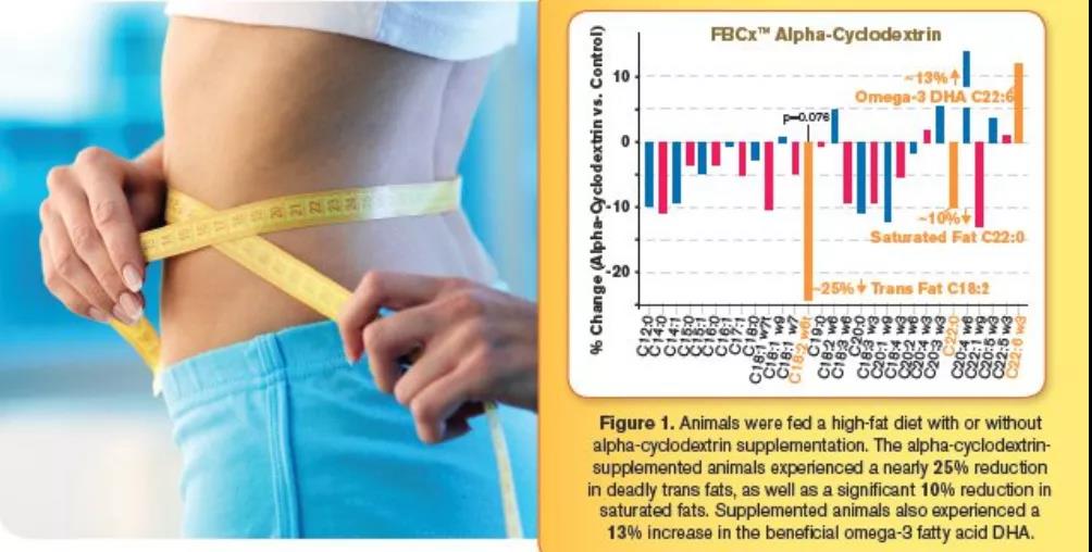 α-環(huán)糊精能選擇性地阻止促發(fā)炎脂肪(如反式脂肪和飽和脂肪)的吸收,而不干擾有益的多不飽和脂肪(如ω-3脂肪酸)。服用α-環(huán)糊精使受試者血液中總脂肪酸的含量顯著降低,其中致命的反式脂肪減少了25%,不健康的飽和脂肪顯著減少了10%,而有益的ω-3脂肪酸大約增加了13%。且α-環(huán)糊精組的飽和脂肪排泄量增加了7倍,而有益的多不飽和脂肪如ω-3的排泄量沒(méi)有增加。另一項(xiàng)研究表明,α-環(huán)糊精的補(bǔ)充使有益的不飽和脂肪含量增加了2.5%,而促進(jìn)炎癥的飽和脂肪和反式脂肪含量分別減少了4.5%和11%。研究表明,對(duì)于一天吃兩頓脂肪含量高的食物的人來(lái)說(shuō),在這些食物之前服用2克α-環(huán)糊精,在吸收之前可以從身體中除去高達(dá)320卡路里的熱量。